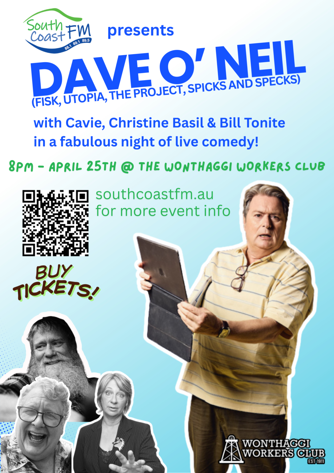 Enjoy a great night out and plenty of laughs while supporting South Coast FM. They’ve lined up an awesome group of comedians, led by the one and only Dave O’Neil, for a fun Saturday night in Wonthaggi.