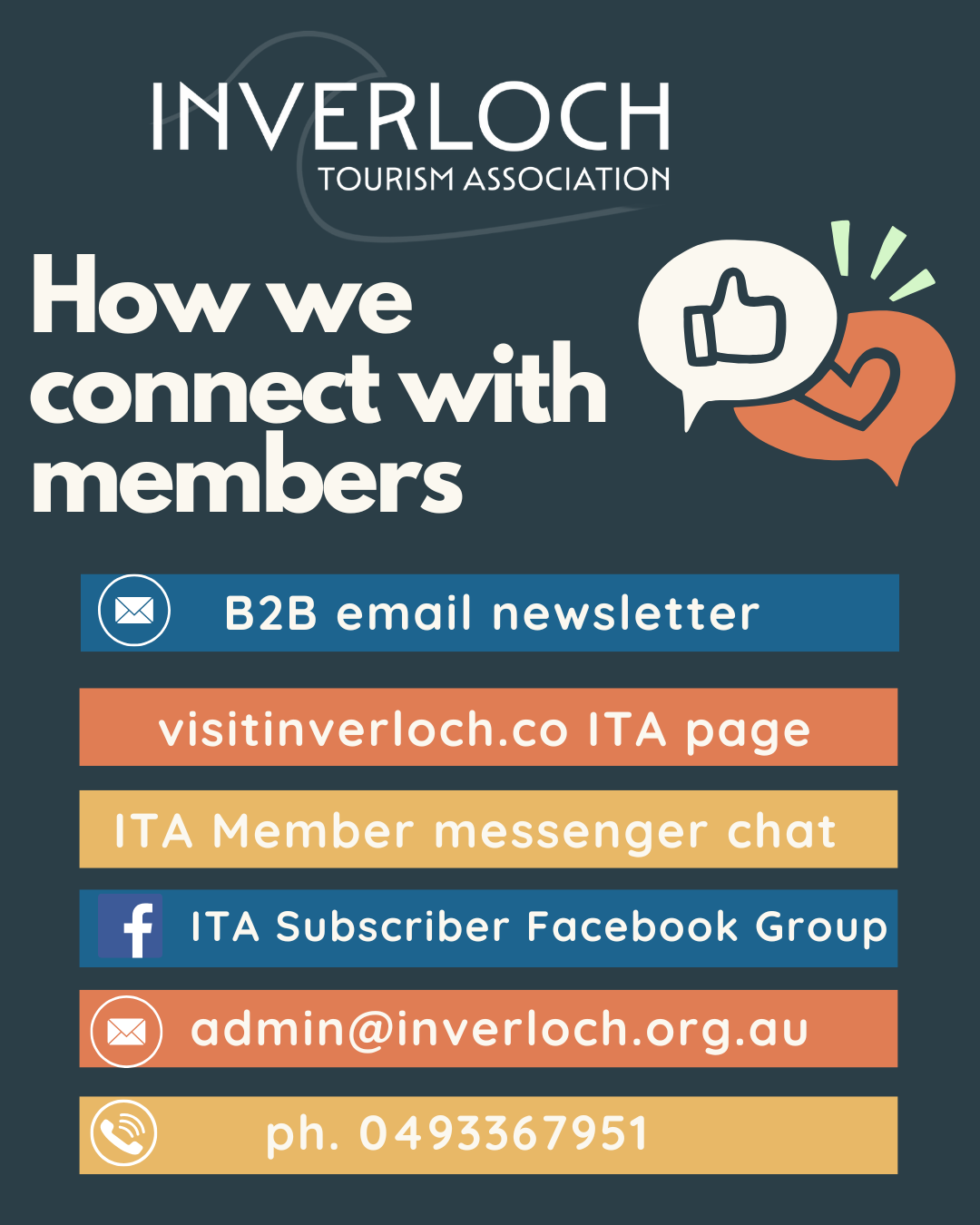 Make sure you're connected via your preferred method and let us know what works best for you. We’re here to keep you in the loop; your way. Don’t forget you can also head to the ITA Member’s resource page on the Visit Inverloch website. Click link here to head to the ITA members page and scroll down to member’s resources.